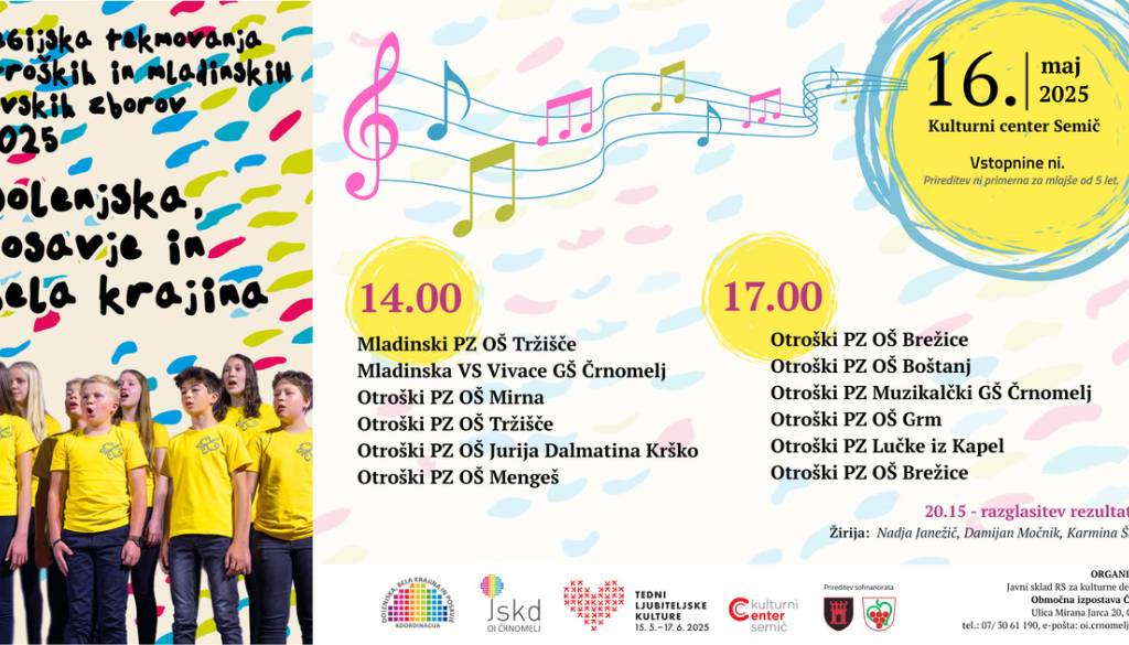 Kulturni center SemičJSKD OI Črnomelj vas vabi na REGIJSKO TEKMOVANJE OTROŠKIH in MLADINSKIH PEVSKIH ZBOROV Dolenjske, Bele krajine in Posavja v petek, 16. maja 2025, ob 14. in ob 17. uri v KC Semič.