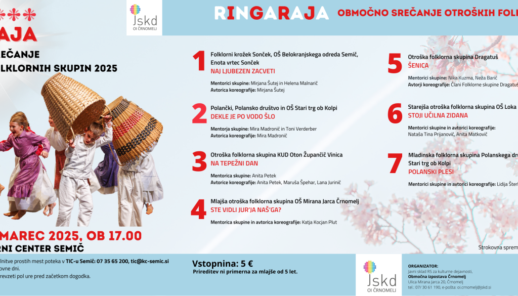 Kulturni center SemičJSKD OI Črnomelj vas vabi na območno srečanje otroških folklornih skupin RINGARAJA 2025 v četrtek, 27. marca, ob 17. uri v KC Semič.