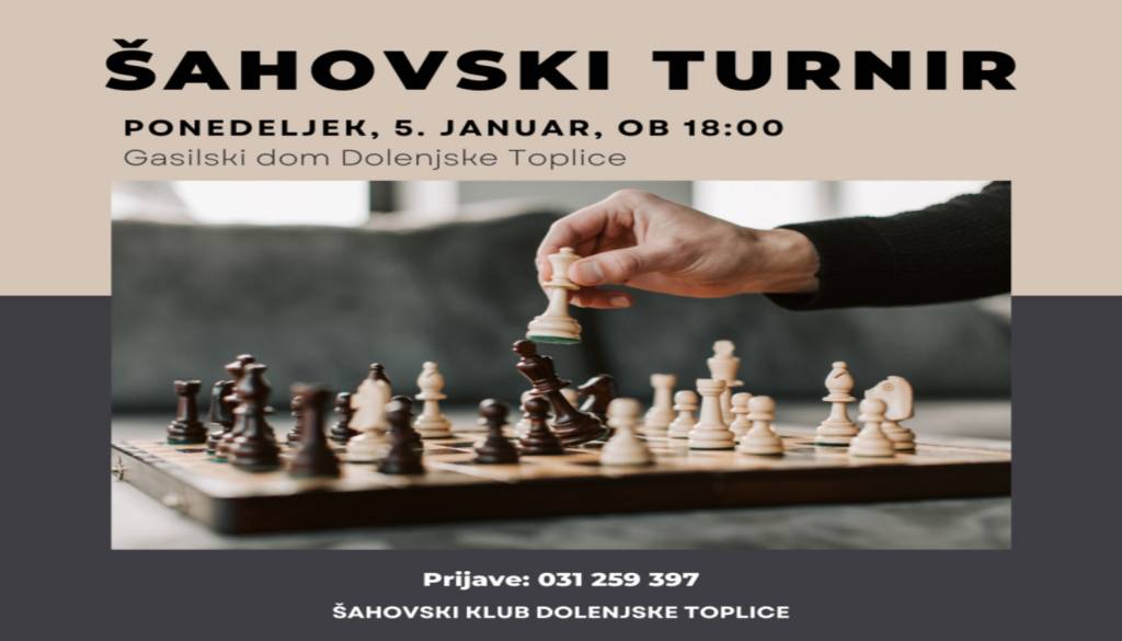 Vsak prvi ponedeljek v mesecu vas Šahovski klub Dolenjske Toplice ob 18:00 vabi na šahovski turnir v Gasilskem domu dolenjske Toplice.