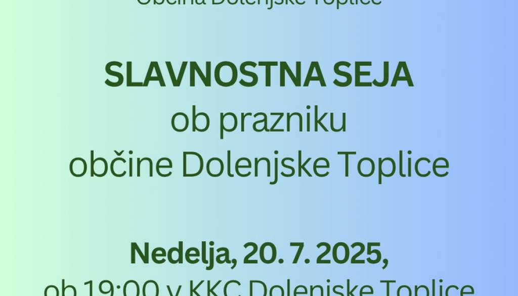 KKC Dolenjske TopliceVabljeni na slavnostno sejo ob občinskem prazniku, ki bo v nedeljo, 20. julija, ob 19. uri v KKC Dolenjske Toplice.