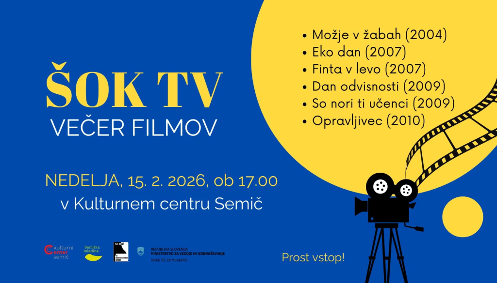 Kulturni center SemičKulturni center Semič in Sem´ška mladina vas vabita na ŠOK TV: Večer filmov v nedeljo, 15. februarja, ob 17.00 v Kulturni center Semič.