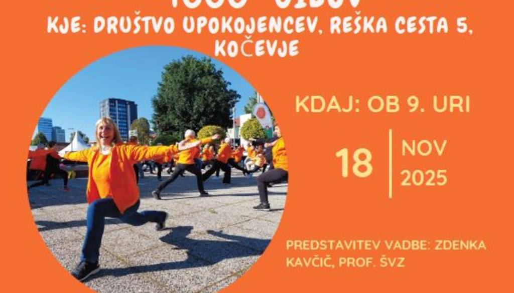 Društvo upokojencev KočevjeV Kočevje prihaja Šola zdravja, vseslovensko društvo, ki že vrsto let spodbuja zdrav način življenja s preprostimi jutranjimi vajami na prostem. Vadba »1000 gibov« je namenjena vsem generacijam in temelji na redni telesni aktivnosti, druženju ter skrbi za dobro počutje.