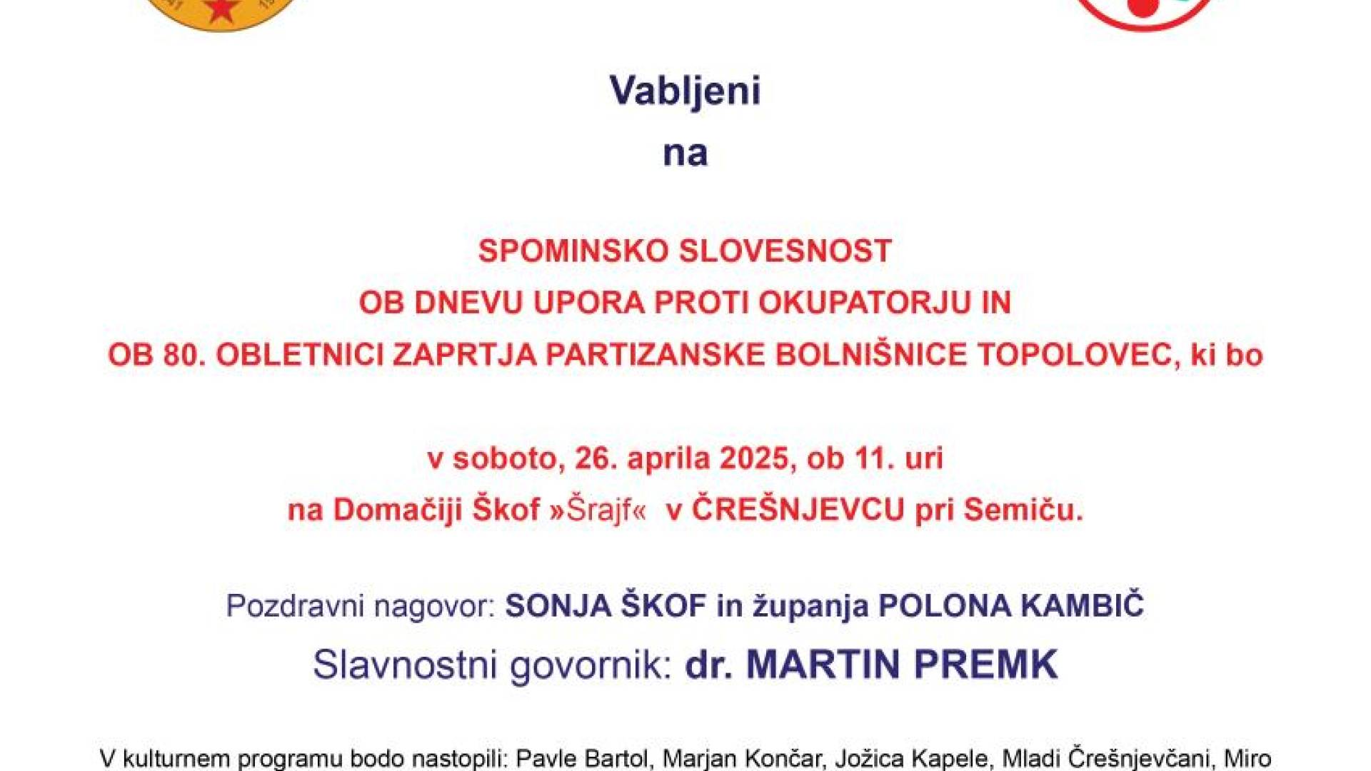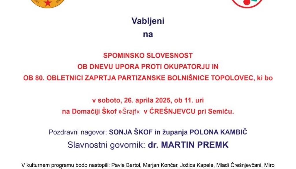 SPOMINSKO SLOVESNOST OB DNEVU UPORA PROTI OKUPATORJU IN OB 80. OBLETNICI ZAPRTJA PARTIZANSKE BOLNIŠNICE TOPOLOVEC.