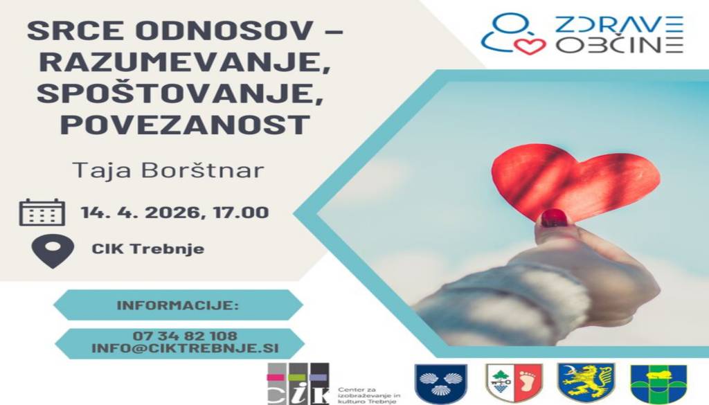 Center za izobraževanje in kulturo TrebnjeVabljeni na brezplačno predavanje »Srce odnosov – razumevanje, spoštovanje, povezanost«, v torek, 14. 4. 2026, ob 17.00 na Centru za izobraževanje in kulturo Trebnje, Kidričeva ulica 2. Na predavanje se lahko prijavite na: https://prijave.snipi.si/30y6ClhNxK6