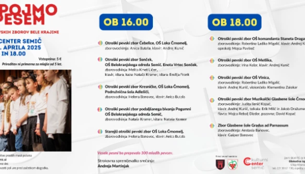 Kulturni center SemičVabimo vas na že 37. srečanje otroških pevskih zborov Bele krajine z naslovom Zapojmo pesem 2025, ki bo v četrtek, 3. aprila 2025, v Kulturnem centru Semič. Izvedli bomo dva koncerta in sicer ob 16. in 18. uri.