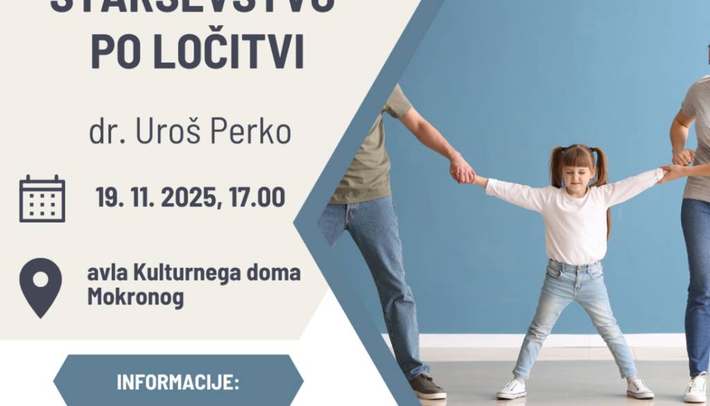 Kulturni dom MokronogV sredo, 19. 11. 2025, ob 17.00 vas vabimo na brezplačno predavanje Starševstvo po ločitvi. Predavanje bo potekalo v avli Kulturnega doma Mokronog. Predavatelj doc. dr. Uroš Perko, psihoterapevt. Predavanje bomo izvedli v okviru programa Zdrave občine, nanj pa se lahko prijavite TUKAJ.