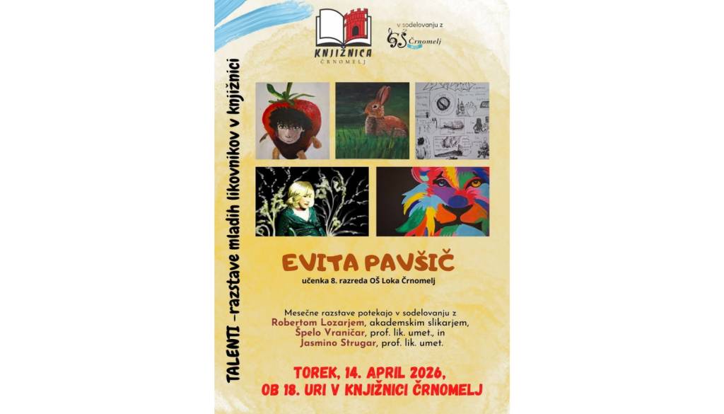 Knjižnica ČrnomeljV Knjižnici Črnomelj pričenjamo z novo, že 9. sezono likovnega natečaja Talenti – razstave mladih likovnikov v knjižnici. Tokrat bo kot zadnja v letošnji sezoni svoja dela na ogled postavila Evita Pavšič, učenka 8. razreda OŠ Loka Črnomelj.