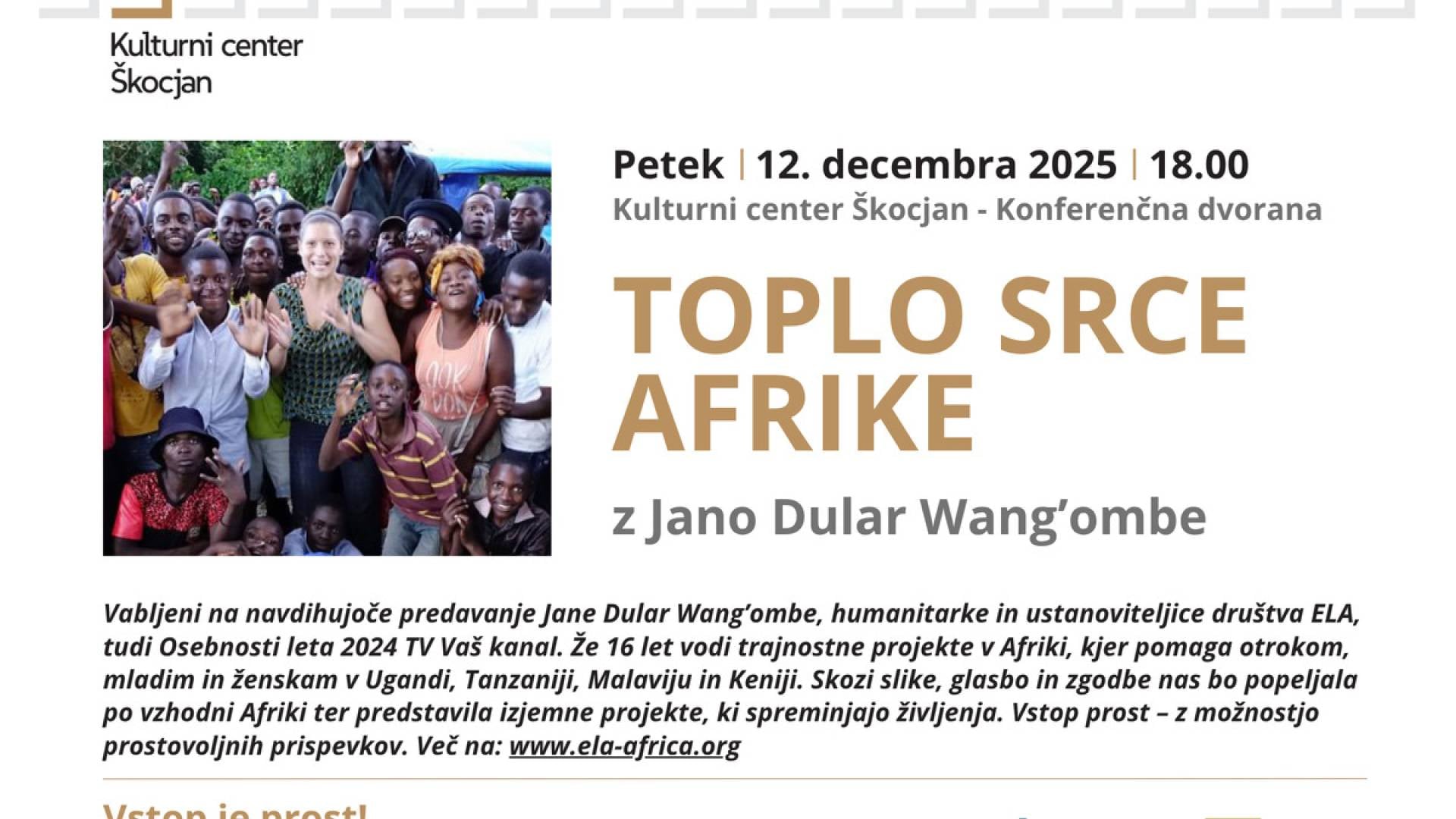 Pridružite se nam na izjemnem večeru z Jano Dular Wang’ombe, humanitarko in ustanoviteljico društva ELA, ki že 16 let vodi projekte za otroke, mlade in ženske v Ugandi, Tanzaniji, Malaviju in Keniji. 🌍✨