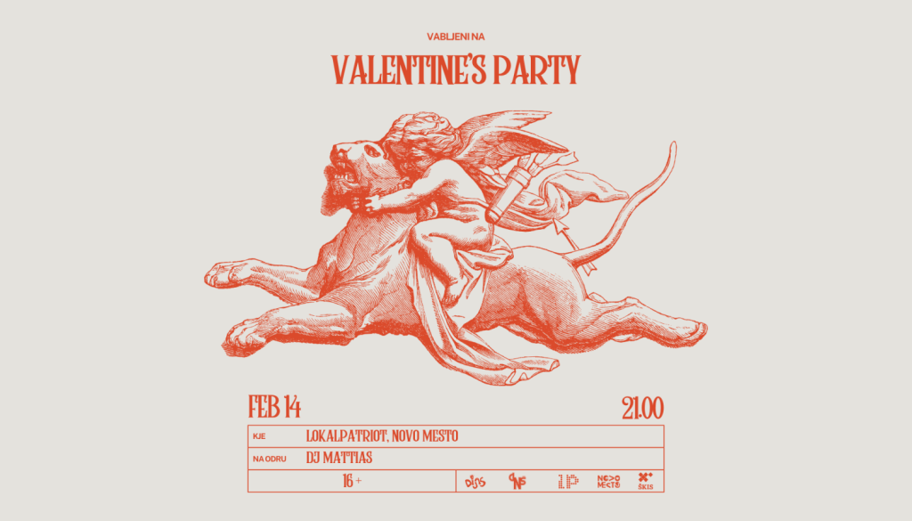 LokalPatriot Novo mestoSkoraj je že tu! Praznik ljubezni, ki se ga spodobi praznovati na veliko! Zaljubljen/a ali ne, v petek, 14. februarja ob 21.00 ne zamudi VALENTINE’S PARTY-ja! Skozi noč nam bo srca grel dobro znani DJ MATTIAS, ki je ustvaril noro energijo že na lanskem Halloween partyju in Kolektivcu, že vrsto let pa spremlja dolenjske maturante na maturantskih izletih. O vrhunski glasbi, energični družbi in nepozabnih spominih zato ni dvoma, na nogah nas bo Mattias kot vedno držal do jutranjih ur! Plesišče je ready, mi tudi, pripravi se še ti!