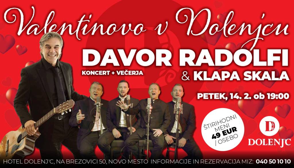 Najlepši dan zaljubljencev obeležite v družbi legendarnega pevca Davor Radolfija in priljubljene Klape Skala, ki bosta s svojimi melodijami pričarala nepozabno romantično vzdušje.