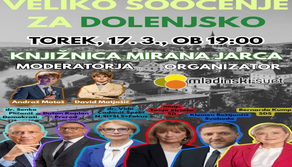 Knjižnica Mirana Jarca Novo mestoPred prihajajočimi volitvami Mladinski svet Novo mesto organizira javno soočenje političnih predstavnikov, namenjeno razpravi o ključnih vprašanjih razvoja Dolenjske. Dogodek bo priložnost za odprt dialog o temah, ki pomembno vplivajo na življenje v regiji, ter za predstavitev konkretnih rešitev in pogledov različnih političnih opcij.