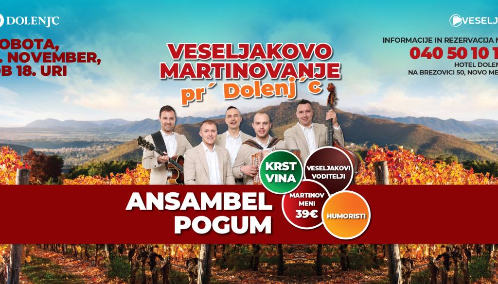 Martinovanje je čas, ko se mošt spremeni v vino, ko domovi in dvorane zadišijo po domačih dobrotah in ko se ljudje zberemo, da skupaj nazdravimo plodovom trdega dela v vinogradih. Zato vabimo vse ljubitelje dobre kapljice, kulinaričnih poslastic in pristne slovenske glasbe, da se nam pridružite na posebnem martinovem večeru, kjer bo za glasbeno kuliso poskrbel edinstveni Ansambel Pogum!