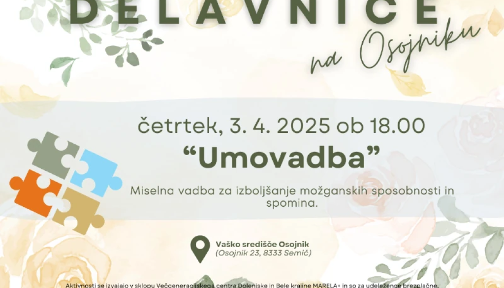 Vaško središče OsojnikVabljeni na interaktivno delavnico umovadbe, kjer bomo s preprostimi in zabavnimi vajami krepili spomin, koncentracijo in miselno prožnost. Skozi praktične vaje boste spoznali tehnike za ohranjanje bistrih misli in izboljšanje kognitivnih sposobnosti v vsakdanjem življenju.