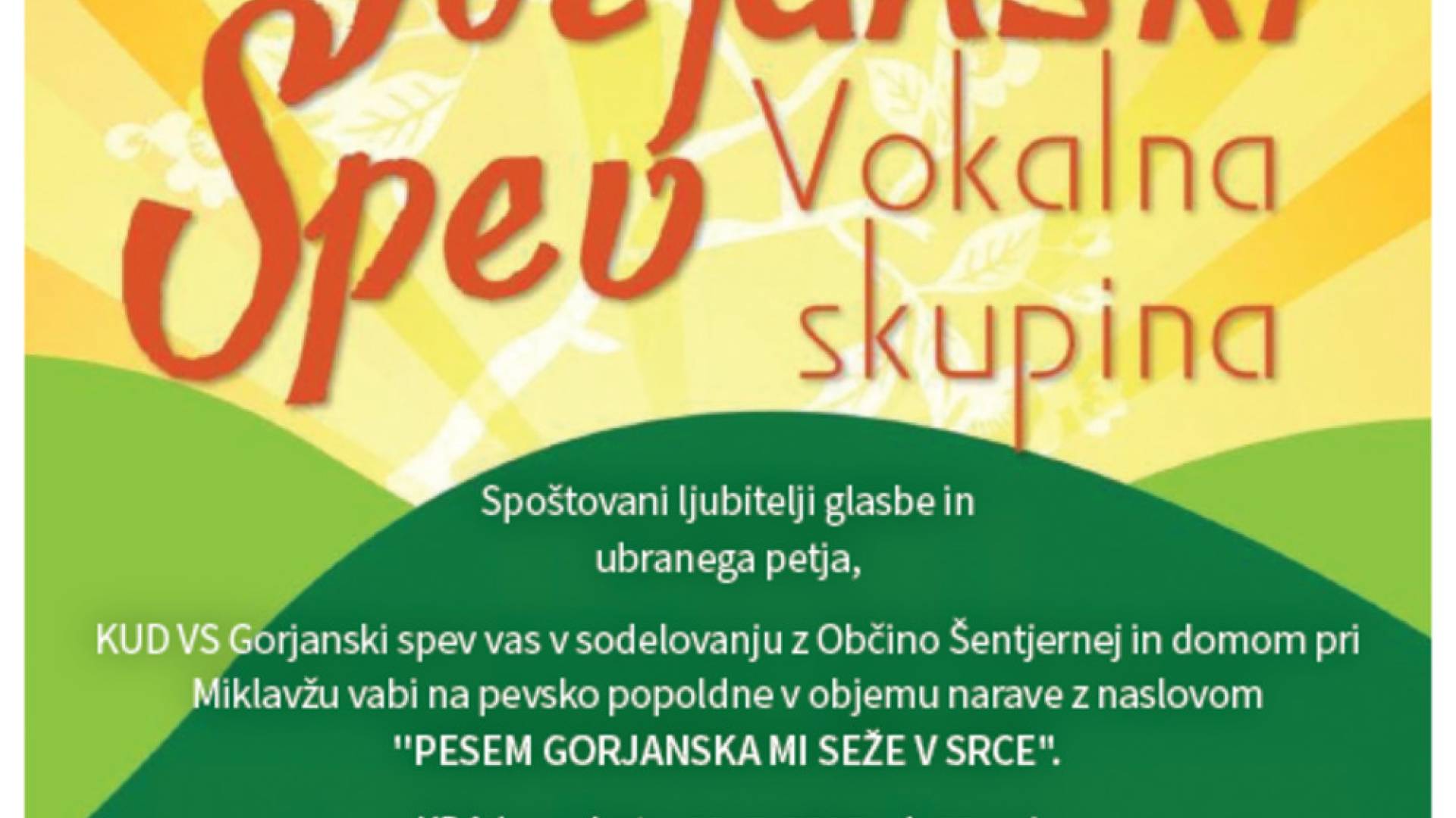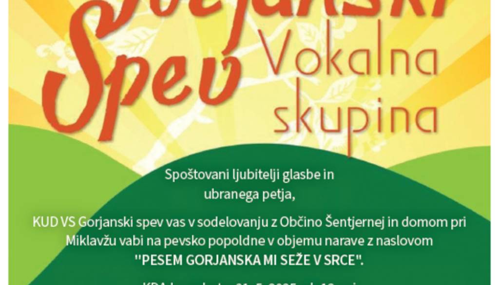 Na GorjancihKUD Vokalna skupina Gorjanski spev v sodelovanju z domom pri Miklavžu vabi na pevsko popoldne v objemu narave z naslovom "PESEM GORJANSKA MI SEŽE V SRCE", ki bo v soboto, 31. maja 2025, ob 12. uri na Gorjancih (dom pri Miklavžu).