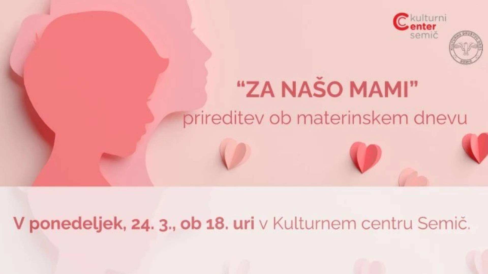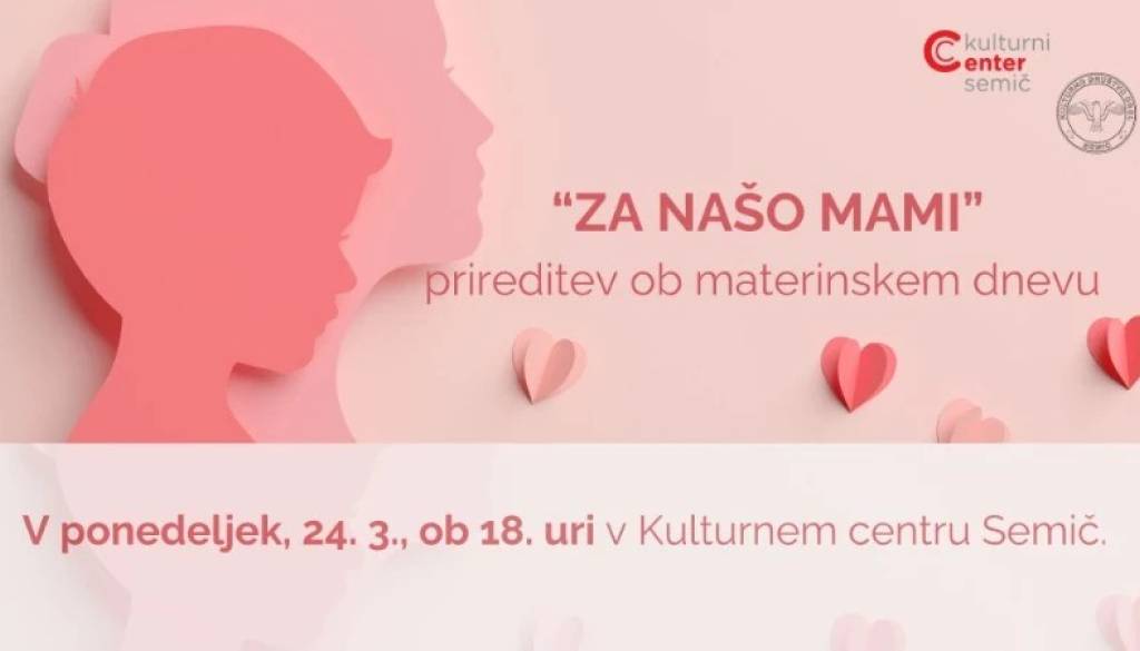 Kulturni center SemičKD Orel Semič in Kulturni center Semič vas ob 18. uri vabita v KC Semič na prireditev ob materisnkem dnevu z naslovom “Za našo mami”.