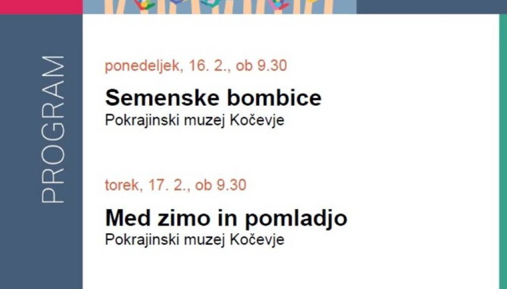 V ponedeljek, 16. 2., bo ob 9.30 potekala delavnica Semenske bombice. V torek, 17. 2., se bo ob 9.30 odvijala delavnica Med zimo in pomladjo. V petek, 20. 2. pa bo ob 9.30 delavnica Recept v stripu.