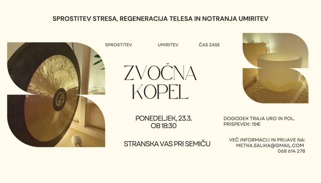 Praprot 15, 8333 SemičMetka Šalika vas vabi na ZVOČNO KOPEL – terapevtsko sprostitveno meditacijo v ponedeljek, 23. 3. 2026, ob 18.30 v prostorih gasilskega doma PGD Stranska vas.