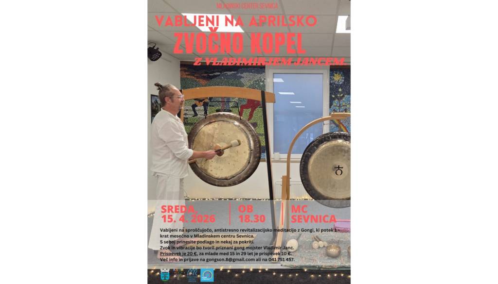 Mladinski center SevnicaVabljeni na zvočno kopel z Vladimirjem Jancem v Mladinski center Sevnica, kjer se boste lahko sprostili po napornem dnevu in razbremenili notranjih napetosti.