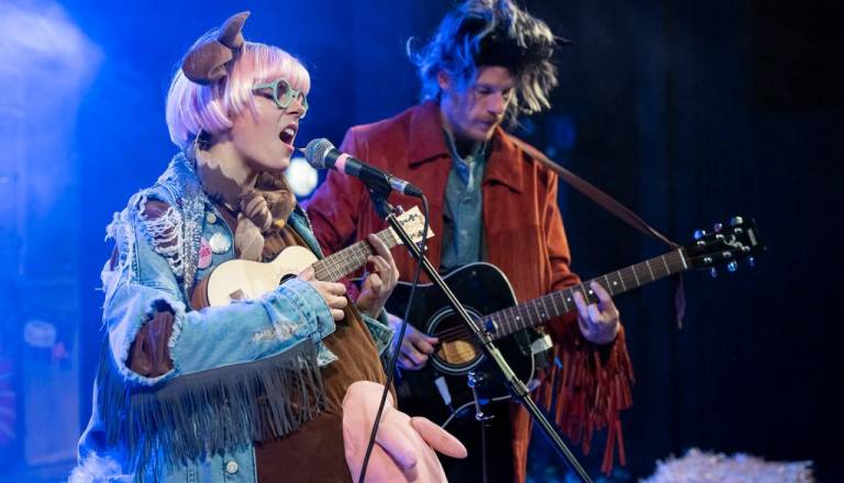 Predstava O kravi, ki je lajala v luno pripoveduje zgodbo krave Mrvice in konja Van den Hija, ki sta zbežala pred poslednjim obiskom pri veterinarju — ona s ...