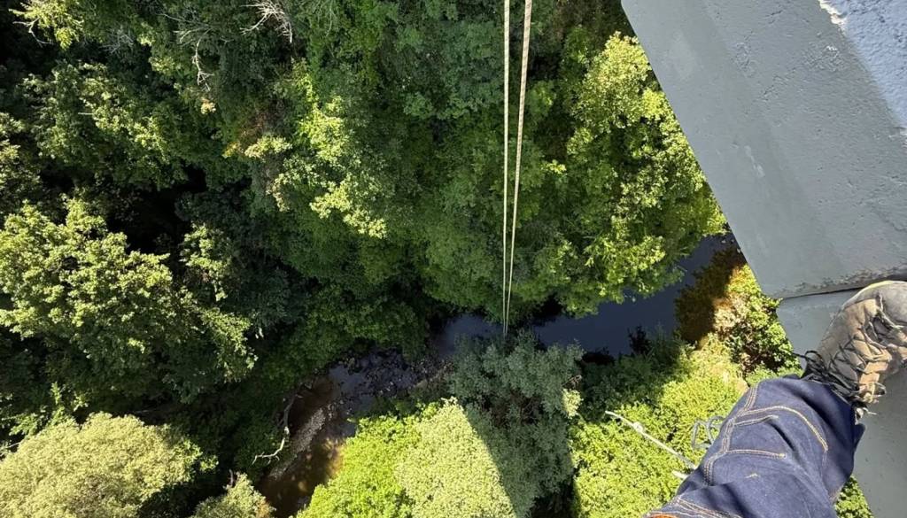 Na Hrvaškem je oseba padla z mostu v Pazinu in čudežno preživela več kot 50 metrov globok padec; reševalci so jo uspešno izvlekli in prepeljali v bolnišnico.