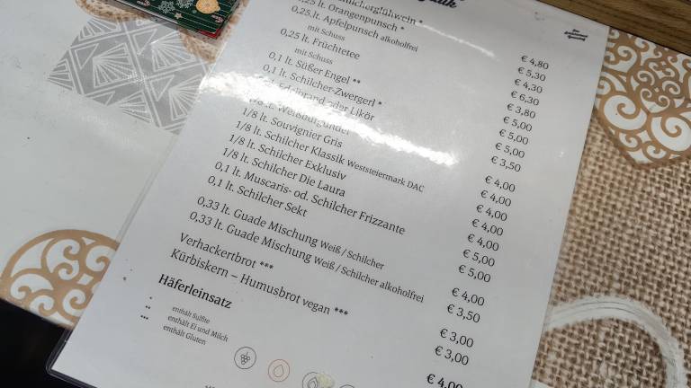 Cene hrane in pijače na stojnicah so dostopne; za porcijo pečenih kostanjev boste odšteli približno štiri evre, za skodelico kuhanega vina pa okoli štiri evre (pazite - za vsako skodelico vam bodo zaračunali kavcijo, torej dodatne štiri evre, ki jih prejmete nazaj, ko vrnete skodelico).