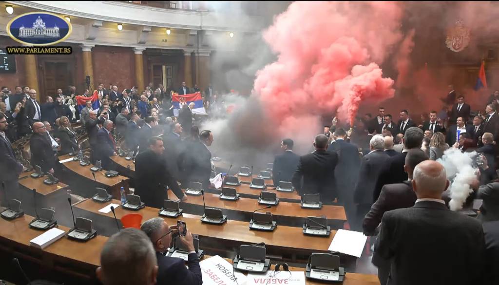 V srbski narodni skupščini se je na današnjem rednem spomladanskem zasedanju zgodilo več incidentov. Srbski mediji poročajo o pretepu, dimnih bombah, baklah v dvorani skupščine, poškodovani naj bi bili tudi dve poslanki vladajoče Srbske napredne stranke.