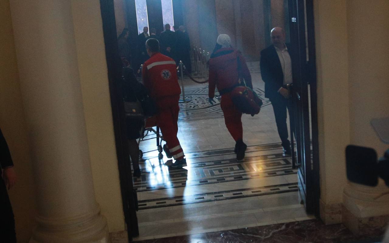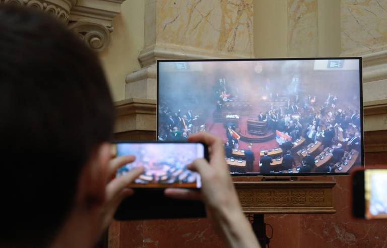 Iz vladajočih strank so opoziciji v rdeče zadimljeni dvorani odgovarjali z vzkliki »ustaši«, nato pa so se poslanci začeli obmetavati s steklenicami vode, pri čemer je bila ena od poslank zadeta v glavo. V nekem trenutku je med njimi prišlo tudi do pretepa, a so jih ustavili varnostniki.