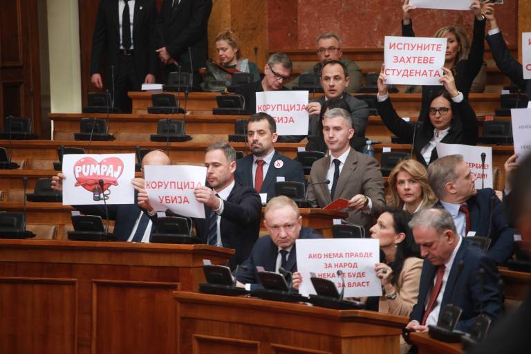 Opozicijski poslanci so po petju himne razgrnili transparente z rdečimi okrvavljenimi rokami in napisi, s katerimi so podprli študentske proteste, ki so se začeli po novembrski nesreči na novosadski železniški postaji. Nato so nekaj po 11. uri sprožili dimne bombe in prižgali bakle ter razobesili transparent Srbija vstaja za padec režima.
