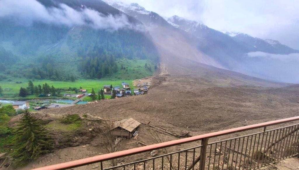 V švicarskih Alpah se je včeraj odlomil večji del ledenika, kar je sprožilo plaz ledu, blata in kamenja. Plaz je zajel majhno vas Blatten in povzročil obsežno škodo.