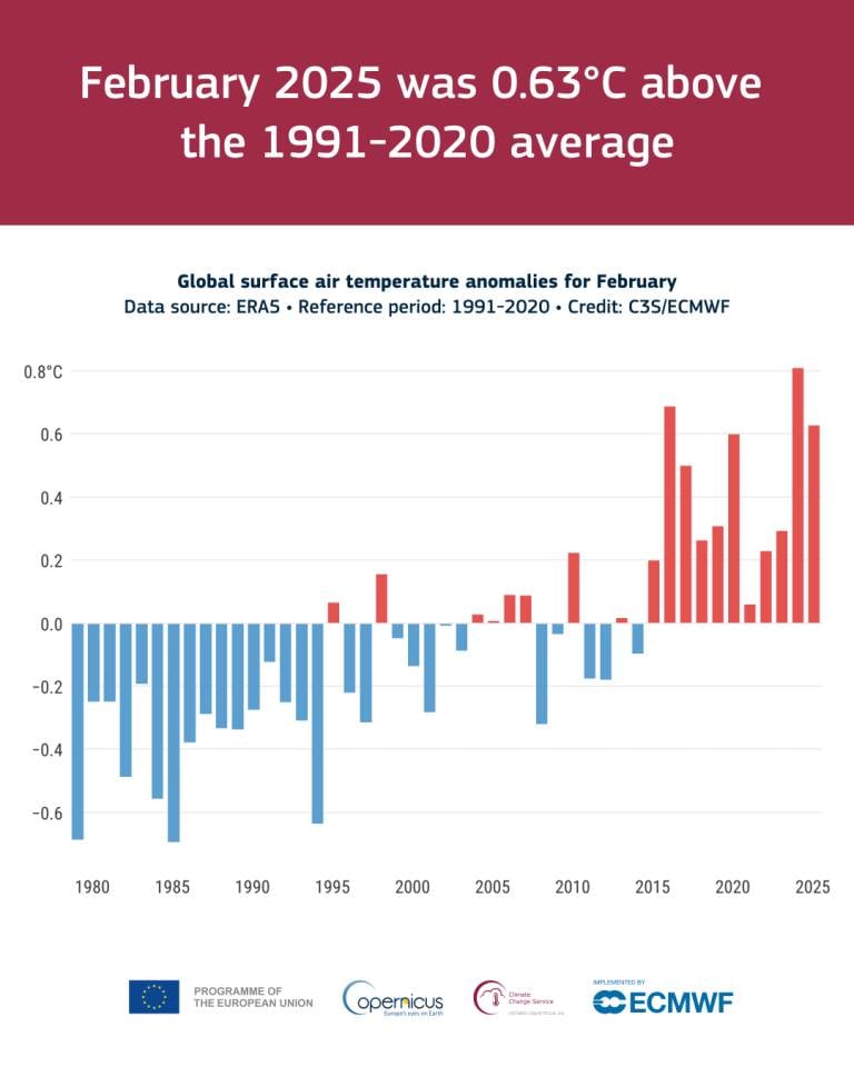 »Februar 2025 nadaljuje niz skoraj rekordnih temperatur iz zadnjih dveh let. Ena od posledic višjih globalnih temperatur je tudi taljenje morskega ledu in rekordno ali skoraj rekordno nizka pokritost z ledom na obeh polih.