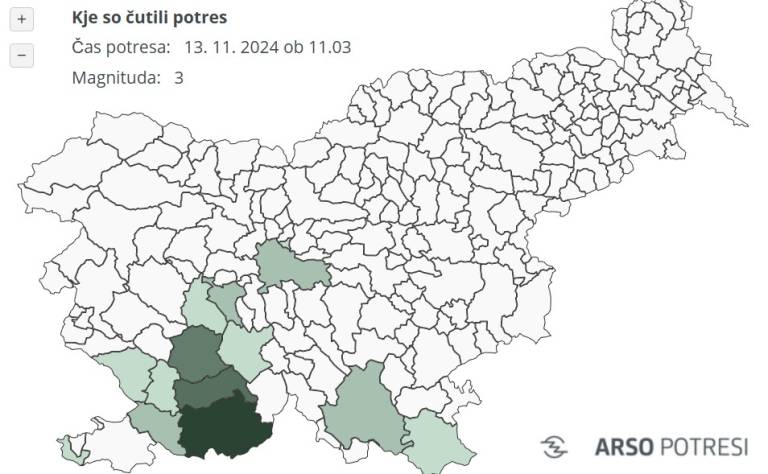 Intenziteta potresa v širšem nadžariščnem območju ni presegla četrte stopnje po evropski potresni lestvici, potres pa so čutili prebivalci jugozahodne Slovenije, so še sporočili iz Urada za seizmologijo na Agenciji Republike Slovenije za okolje.