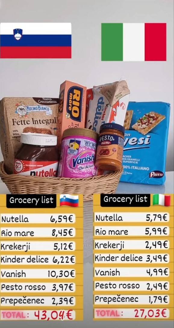 Po njihovih izračunih bi za omenjen seznam izdelkov v Sloveniji odšteli okoli 43 evrov, medtem ko jo je nakup v Italiji stal 27 evrov.