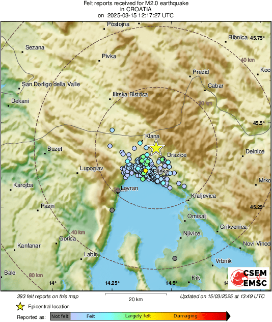 Danes ob 12.17 je Reko in njeno širšo okolico stresel potres z magnitudo 1,9 po Richterjevi lestvici, poroča Evropski mediteranski seizmološki center (EMSC).