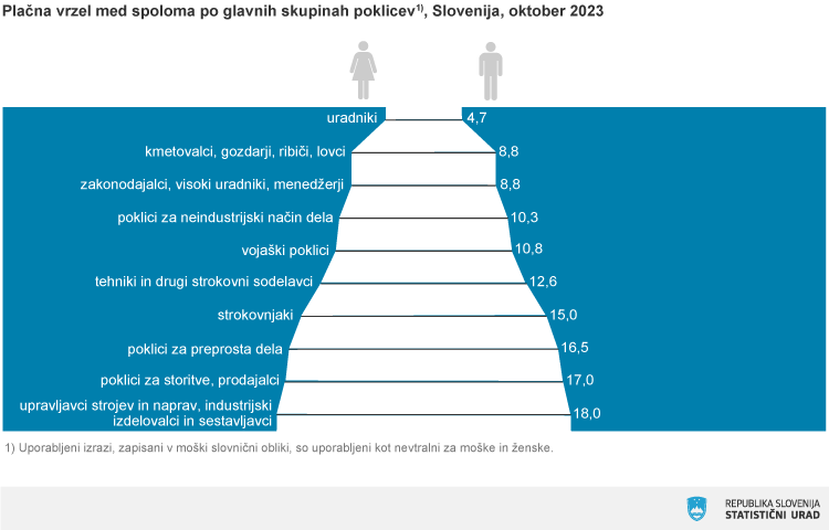 Oktobra leta 2023 je bila povprečna mesečna bruto plača žensk za 5,7 odstotkov nižja od plače moških, ta vrzel pa je bila največja v poklicni skupini upravljalci strojev in naprav, industrijski izdelovalci in sestavljalci, najmanjša, 7,7-odstotna vrzel pa je bila prisotna med uradniki.