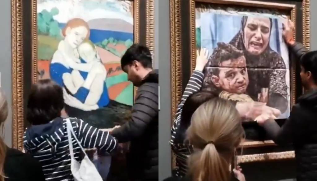 Aktivisti skupine Youth Demand so v Narodni galeriji v Londonu na znamenito sliko Pabla Picassa 'Le Maternite' oziroma Materinstvo prilepili fotografijo, ki prikazuje mamo in njenega otroka v Gazi. Ta je delo fotoreporterja Alija Jadallaha, poroča Index.