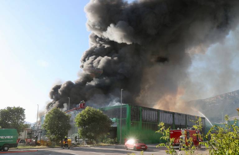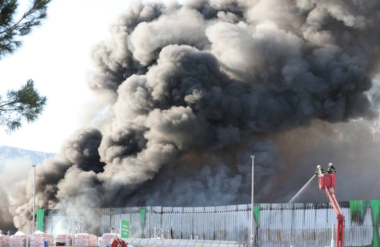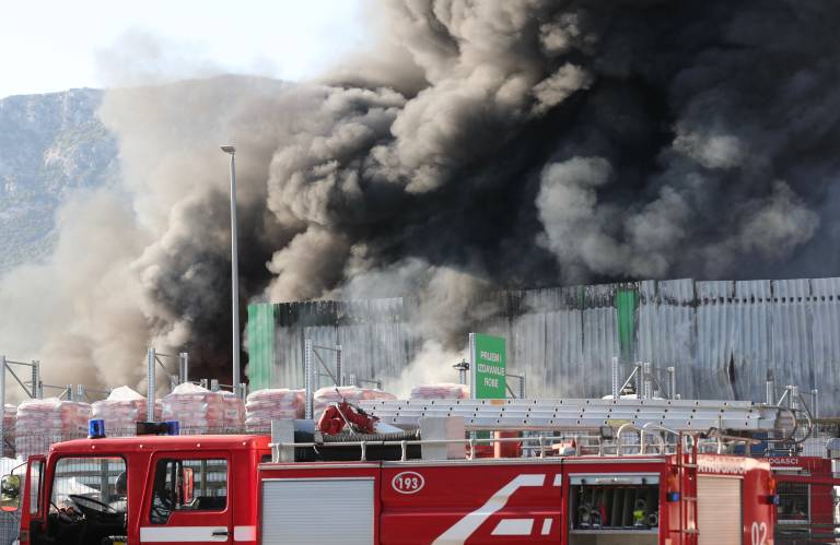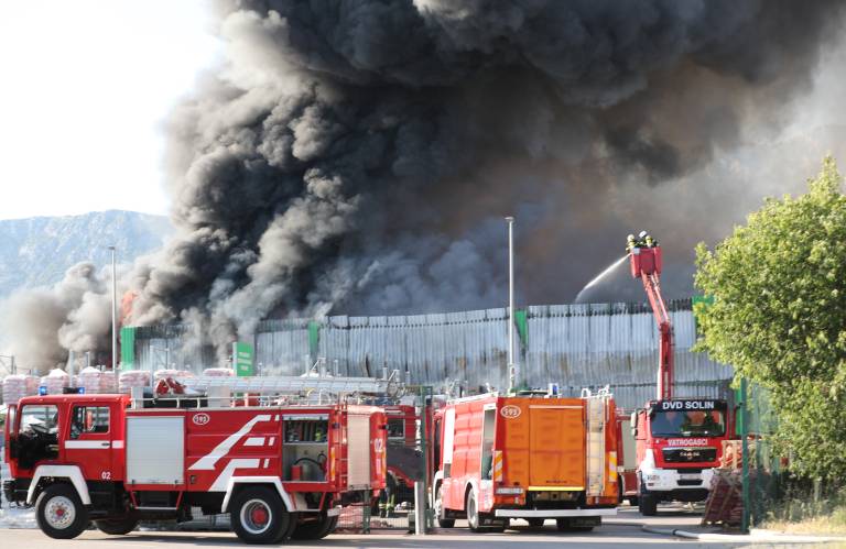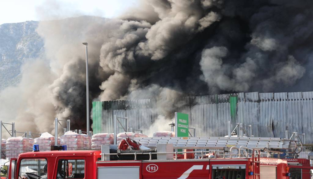 V skladišču podjetja Pevex v Splitsko-dalmatinski županiji je izbruhnil obsežen požar. Gasilci skušajo preprečiti širjenje ognja.