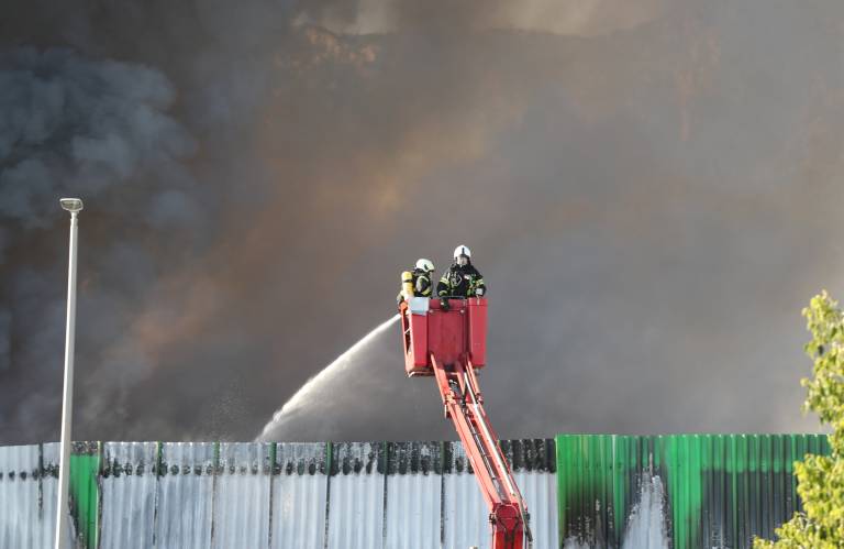 Gasilci poročajo, da požar povzroča gosto dimno zaveso, a je širjenje ognja trenutno pod nadzorom.