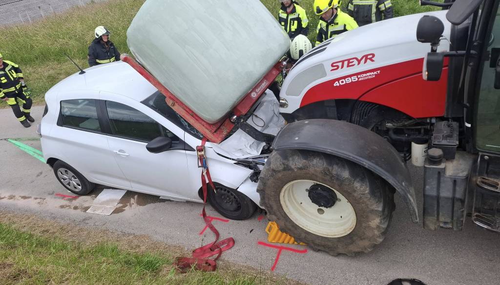 Voznik traktorja je trčil v osebno vozilo, posredovali so gasilci.