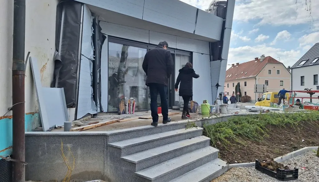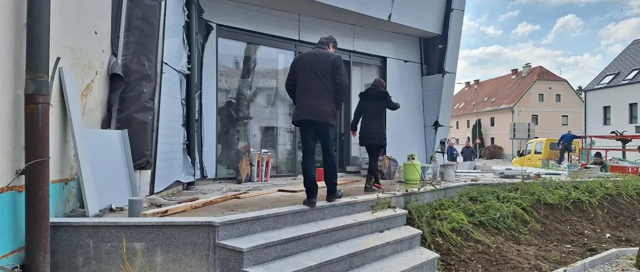 Te dni zaključujejo zunanje stopnišče s polaganjem kamna, čemur bo sledila vgradnja požarnih vrat in izvedba meritev.