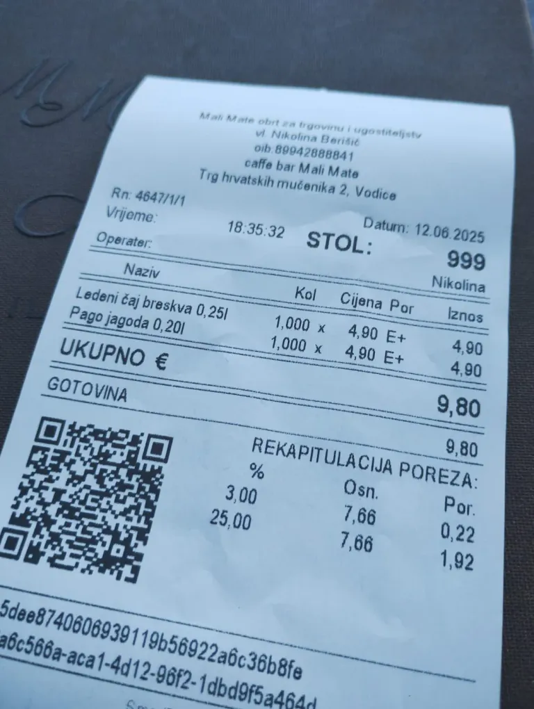 Na računu, izdanem 12. junija letos, sta navedeni dve pijači: ledeni čaj breskev 0,25 l in Pago jagoda 0,20 l, vsaka po 4,90 evra. Skupni znesek – 9,80 evra.