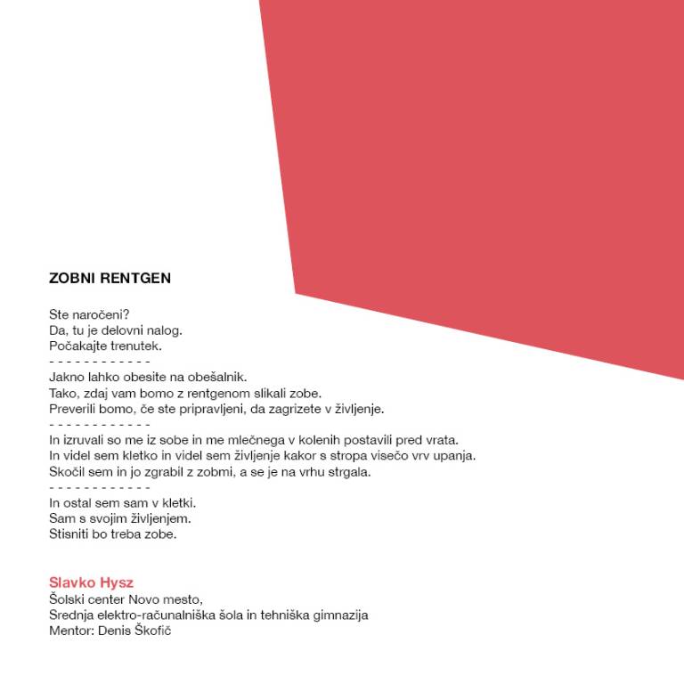 »Pesem Zobni rentgen, deljena na štiri kitice, je v svoji vsebini jasno ločena na dva dela, ki sta, vsak s svojimi vrlinami, prepričala komisijo. V prvih dveh kiticah pesmi bralca v dogajanje in medias res vpelje odrezav dialog, povedi pa se skozi kitici daljšata, stopnjujeta, dokler ne privedeta do preobrata. V drugi polovici pesmi se avtor uspešno preigrava z zobatimi besednimi igrami in jih vpeljuje v pesem, brez da bi pri tem izgubil razumevanje ali zanimanje bralca, vsakdanjo situacijo kot je obisk zobozdravnika – četudi ta plaši mnoge – pa uspešno prelevi v nekaj več, v strah pred neznanim, vsem, kar še prihaja.«
