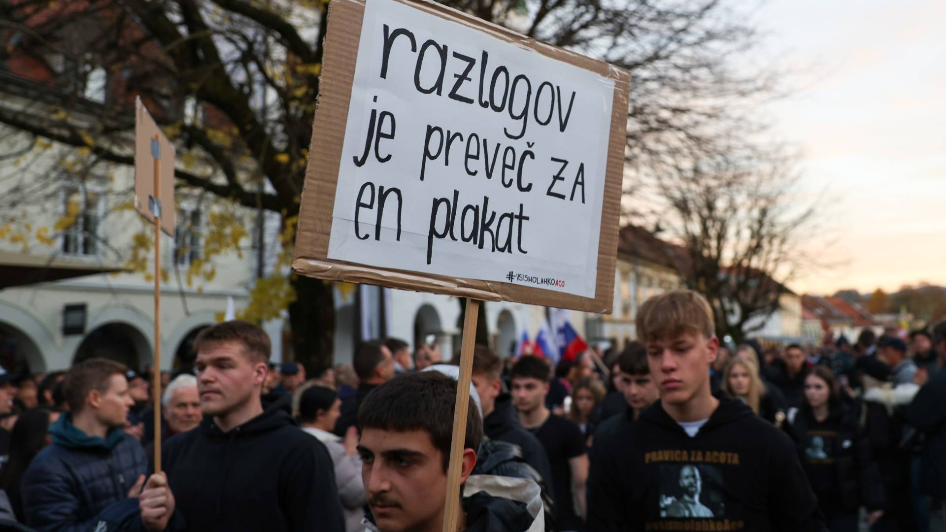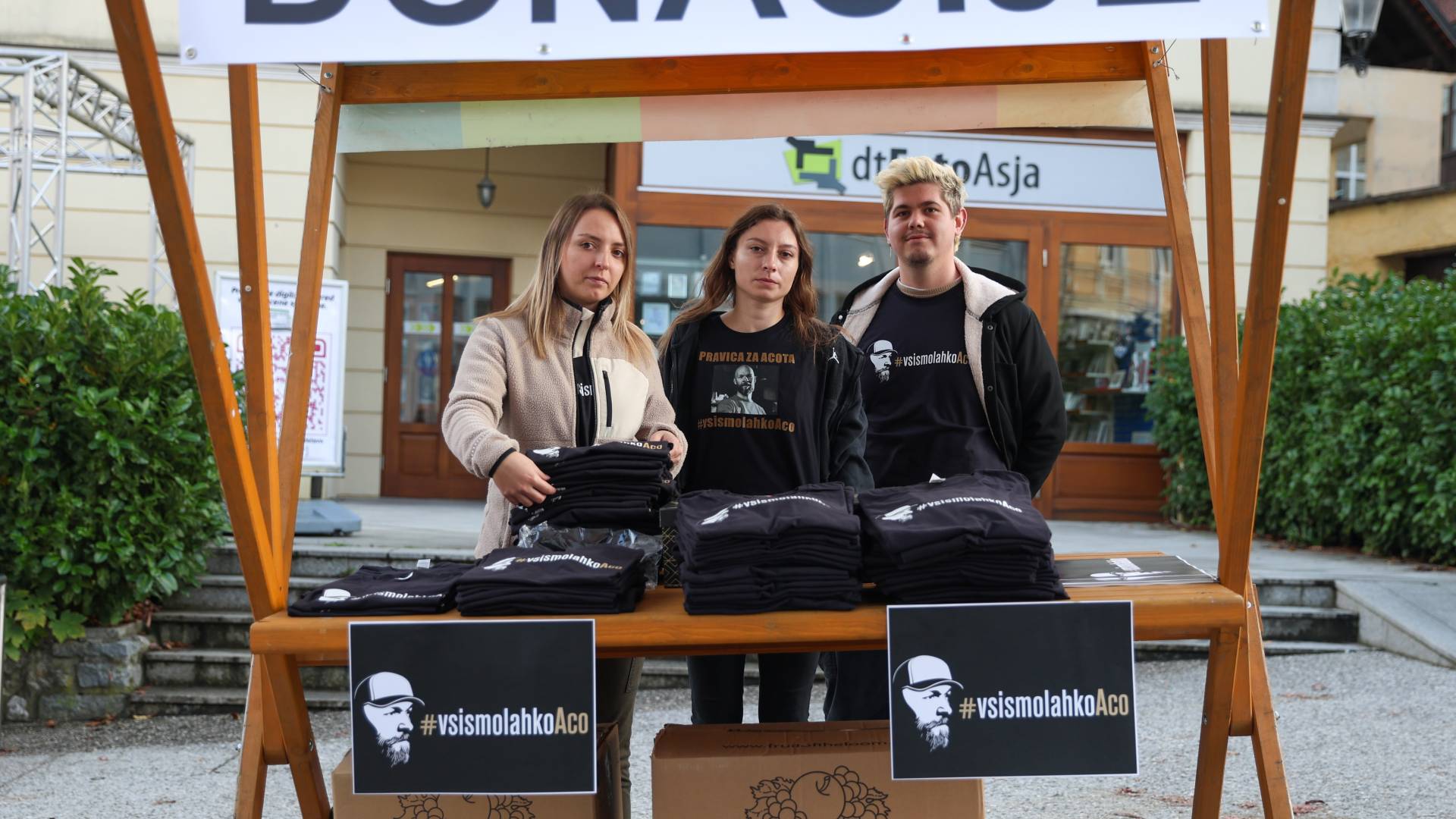 16.03 Na stojnicah ponujajo majice in šilt kape #vsismolahkoaco ter zbirajo prostovoljne prispevke oziroma donacije za družino pokojnega. Protestniki, ki se zbirajo, nosijo majice Acotu v čast z napisom Vsi smo lahko Aco.
