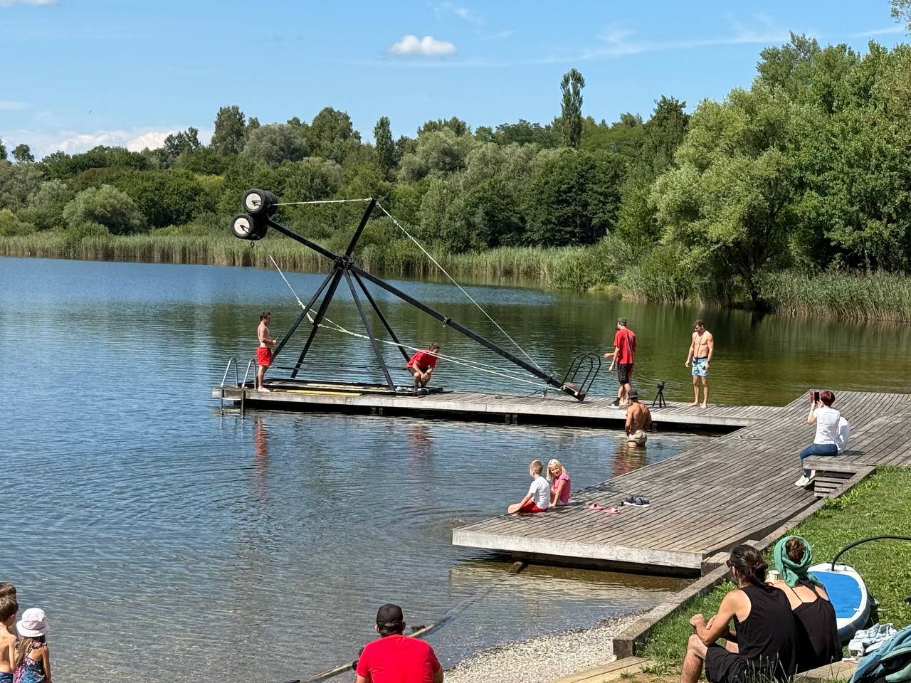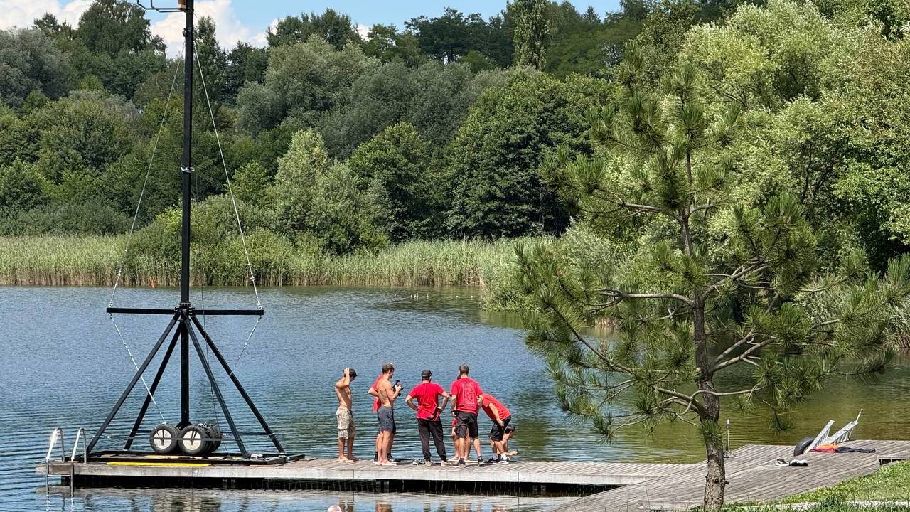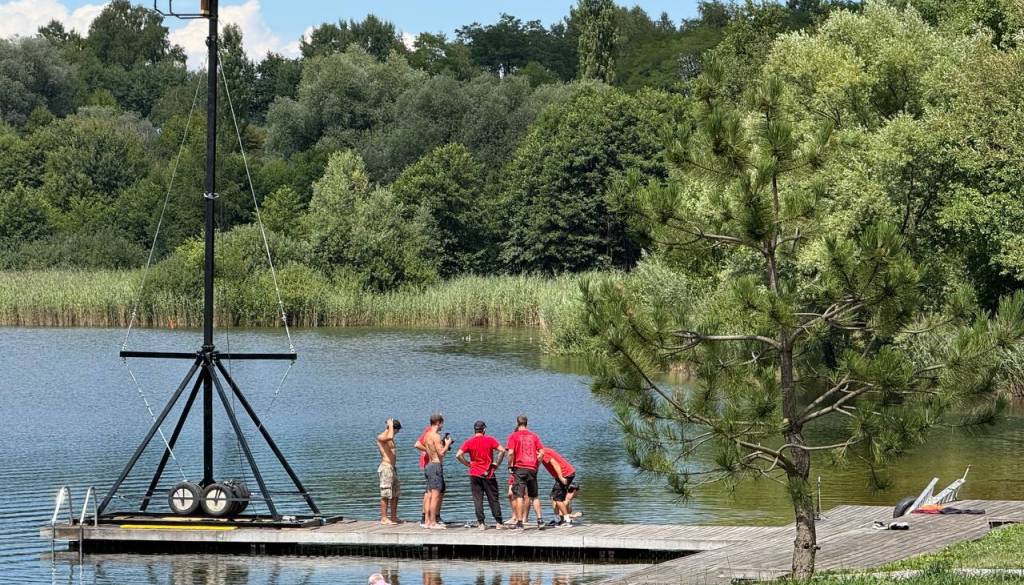 Akrobate svetovnega ranga ni zmotila niti precej hladna voda Kočevskega jezera, termometer naj bi pokazal le dobrih 21 stopinj.