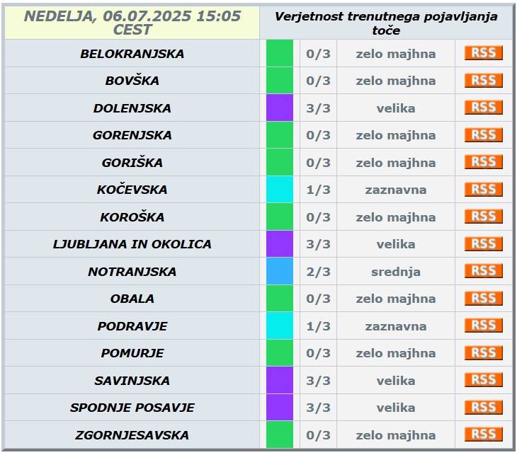 Agencija Republike Slovenije za okolje je Dolenjsko, Ljubljano z okolico, Savinjsko in Spodnje Posavje izdala vijoličasto opozorilo za veliko verjetnost trenutnega pojavljanja toče.
