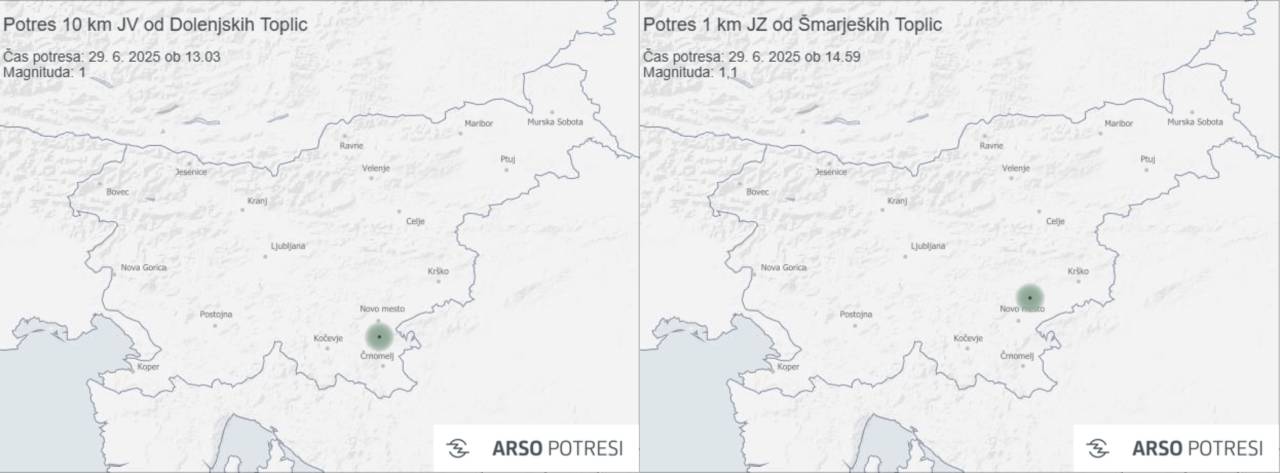 Seizmografi državne mreže potresnih opazovalnic danes na Dolenjskem zabeležili dva potresa: prvega ob 13.03 z žariščem deset kilometrov jugovzhodno od Dolenjskih Toplic, drugega ob 14.59 z žariščem en kilometer jugozahodno od Šmarjeških Toplic.