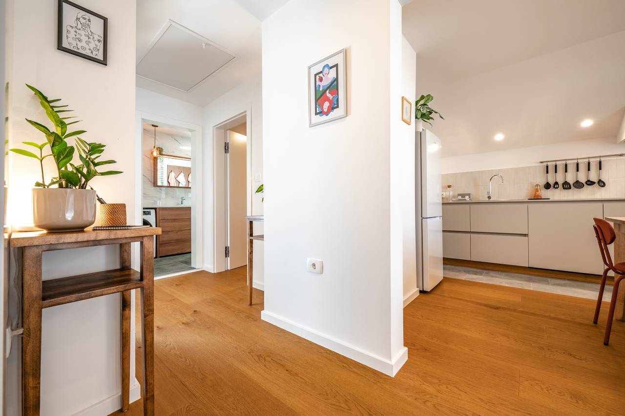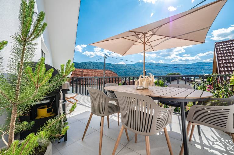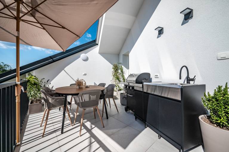Nič drugačen luksuz vas ne pričaka ob vstopu na teraso, obogateno z zunanjo kuhinjo in veliko mizo, ki je kot nalašč za druženje ob sončnem zahodu z dobro hrano, pijačo in razgledom.