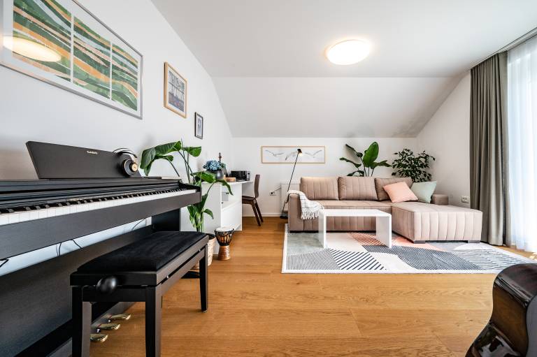 Apartma Strato ponuja vse in še več, kar bi si še tako zahteven gost na Kočevskem lahko želel. Polno opremljena moderna kuhinja z zalogo osnovnega živilskega asortimana, elegantno kopalnico, prostorno glavno spalnico in dodatno spalnico s PlayStation kotičkom ter udobnim dnevnim prostorom z izbranimi detajli kot so piano, kitara, tolkala in djembe, delovni kotiček s tiskalnikom in ogromno televizijo vsakemu gostu vzame dih.
