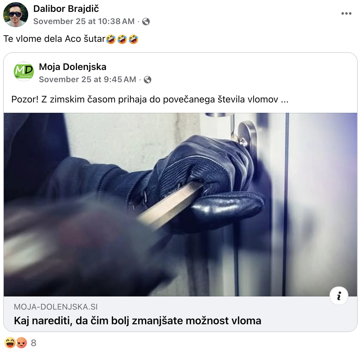 Najnovejši val takšnih objav jasno kaže, da slovenski spletni prostor nima vzpostavljenih primernih mehanizmov za hitre in učinkovite reakcije v primerih, ko je tveganje za eskalacijo nasilja realno. Hkrati pa opozarja, da se lahko ena oseba ali en profil z brezsramnimi javnimi izjavami dotakne najbolj ranljive točke skupnosti - tragedije, ki je prizadela celotno regijo.