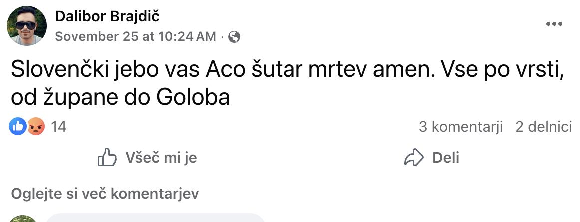 V eni od objav je zapisano: »Slovenčki, j*** vas Aco Šutar mrtev. Amen. Vse po vrsti, od župane do Goloba.«