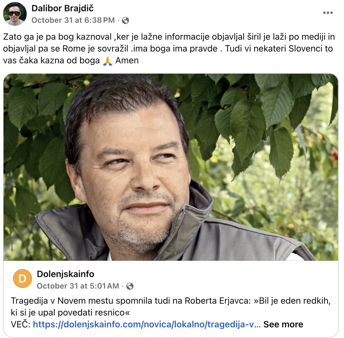 Delil je tudi objavo našega portala Dolenjskainfo, ki smo jo pripravili v spomin na smrt Roberta Erjavca in pripisal, da naj bi »bog kaznoval« novinarja, ki je objavljal »lažne informacije«, ob tem pa dodaja, da bo »tudi druge dosegla kazen«.
